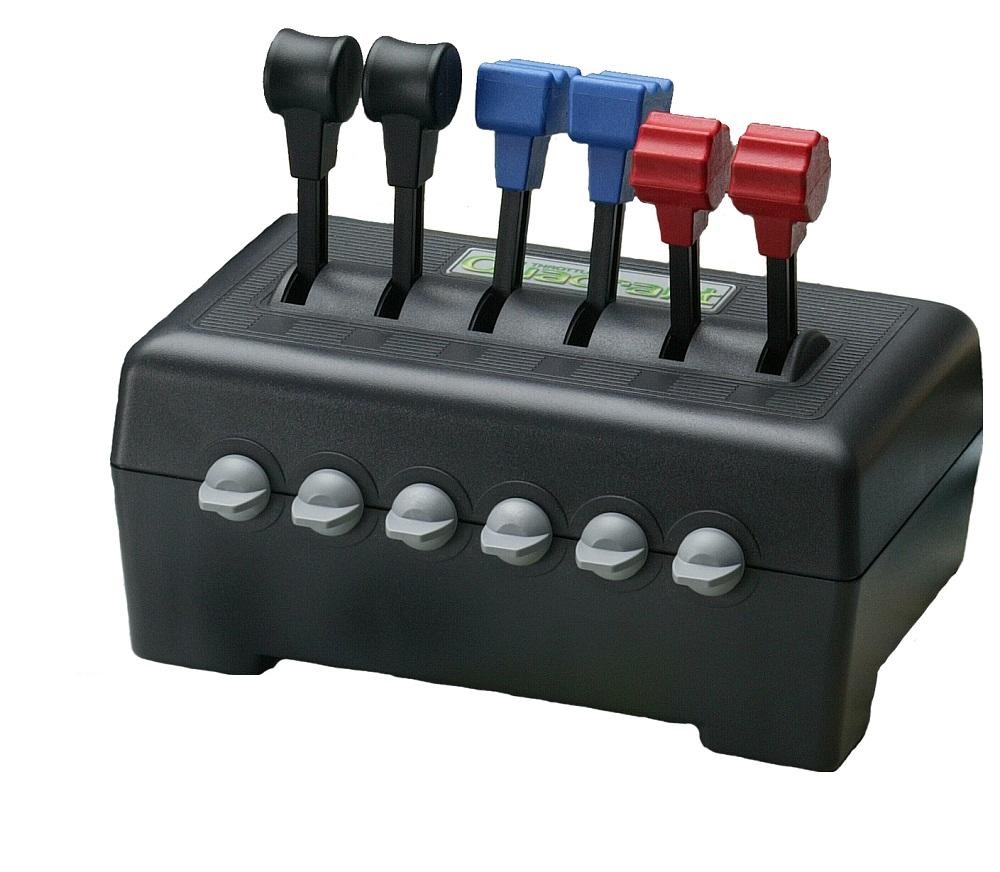 The CH Throttle Quadrant offers 6 axes and 12 buttons of configurable features for both multi-engine and twin-engine aircrafts. Unit includes removable knobs for customs configuration (2 blue, 2 red, and 4 black knobs included) and 6 physical detents.