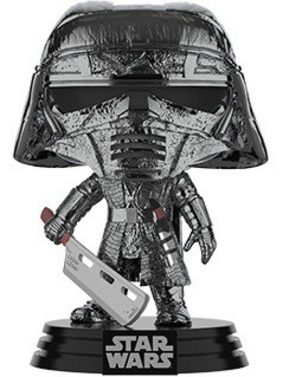 Bring home an electronic Pop! Kylo Ren, hematite chrome Pop! Knight of Ren (blaster), hematite chrome Pop! Knight of Ren (club), hematite chrome Pop! Knight of Ren (scythe), hematite chrome Pop! Knight of Ren (cannon), hematite chrome Pop! Knight of Ren (blade) and hematite chrome Pop! Knight of Ren (axe), a 10” glow in the dark Pop! Kylo Ren, Pop! Dark Rey, a metallic Pop! C-3PO™ with red eyes.